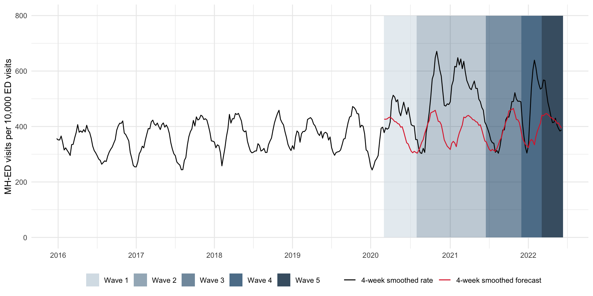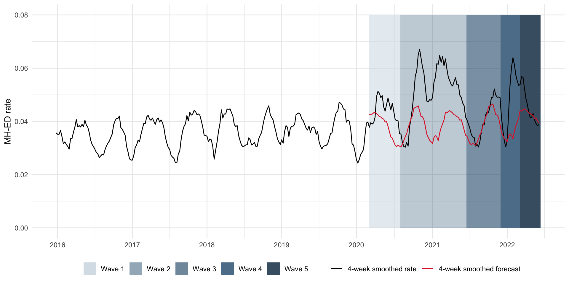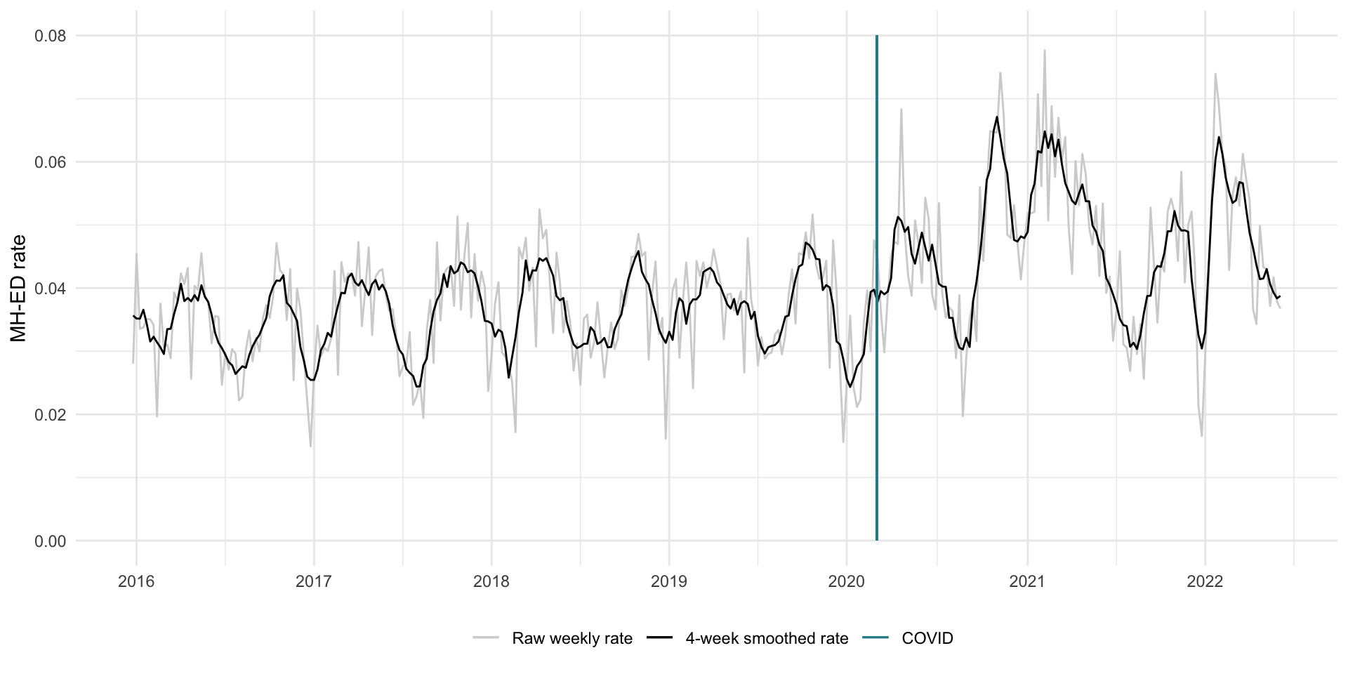 breaks = c("Raw weekly rate", "4-week smoothed rate", "COVID"),
